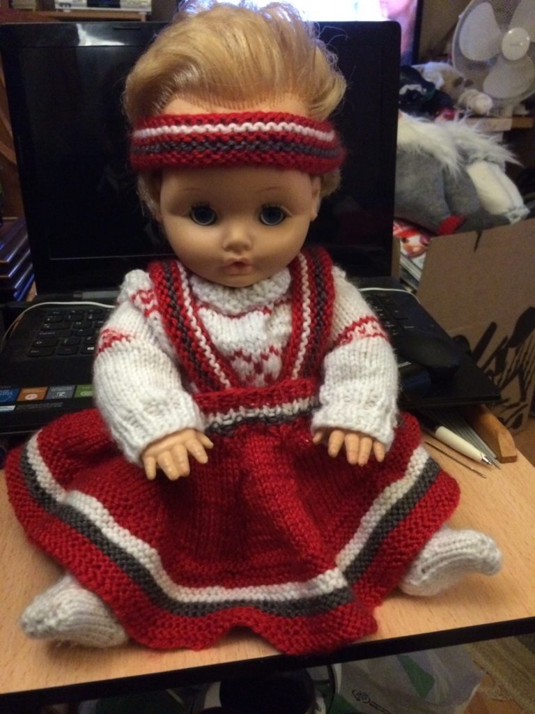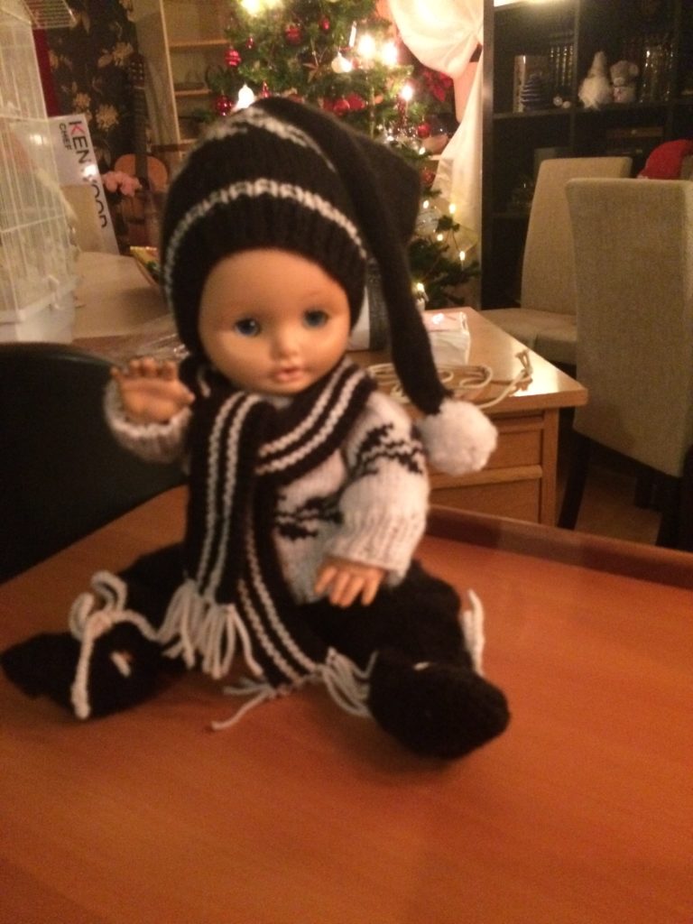 Had to knit the Christmas outfit first. Sweather, skirt, socks and headband in red and white with a tiny strip of grey. This was so fun that I had to make some more with other colours. Some of them I had to make the pattern before I started to knit. I will post more pictures when I am finished with all the things to each outfit. If there is anybody who have small patterns to share with me please send me a picture on mail or messenger. My adress is on the homepage.
