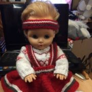 Had to knit the Christmas outfit first. Sweather, skirt, socks and headband in red and white with a tiny strip of grey. This was so fun that I had to make some more with other colours. Some of them I had to make the pattern before I started to knit. I will post more pictures when I am finished with all the things to each outfit. If there is anybody who have small patterns to share with me please send me a picture on mail or messenger. My adress is on the homepage.